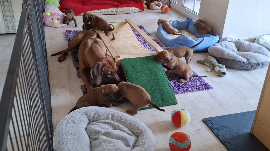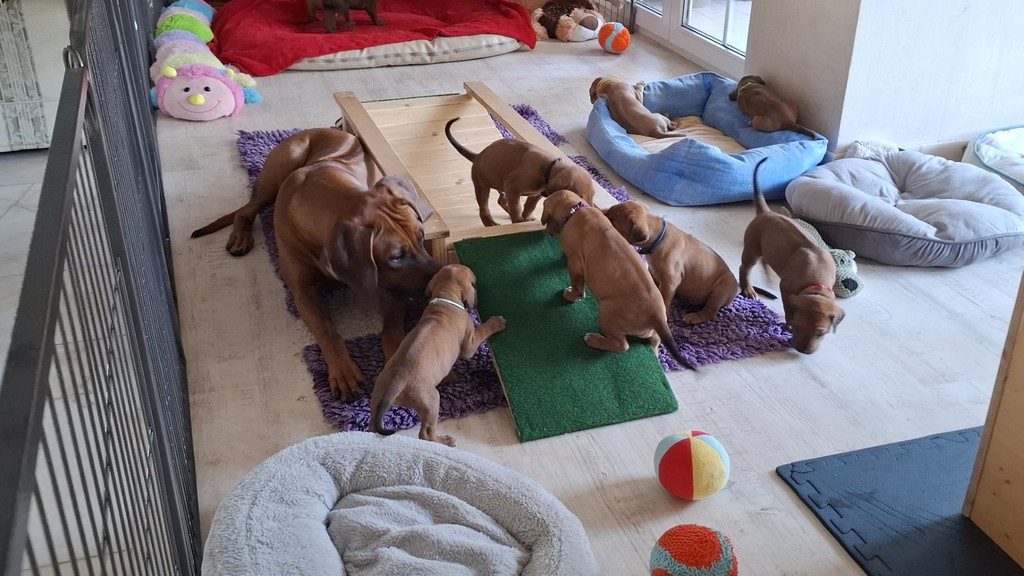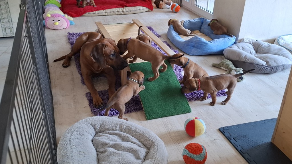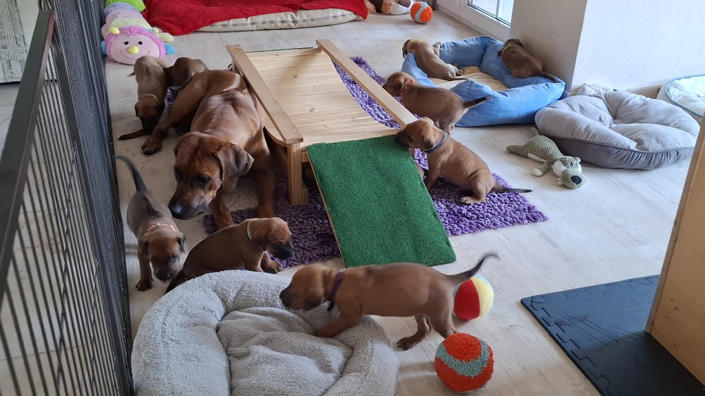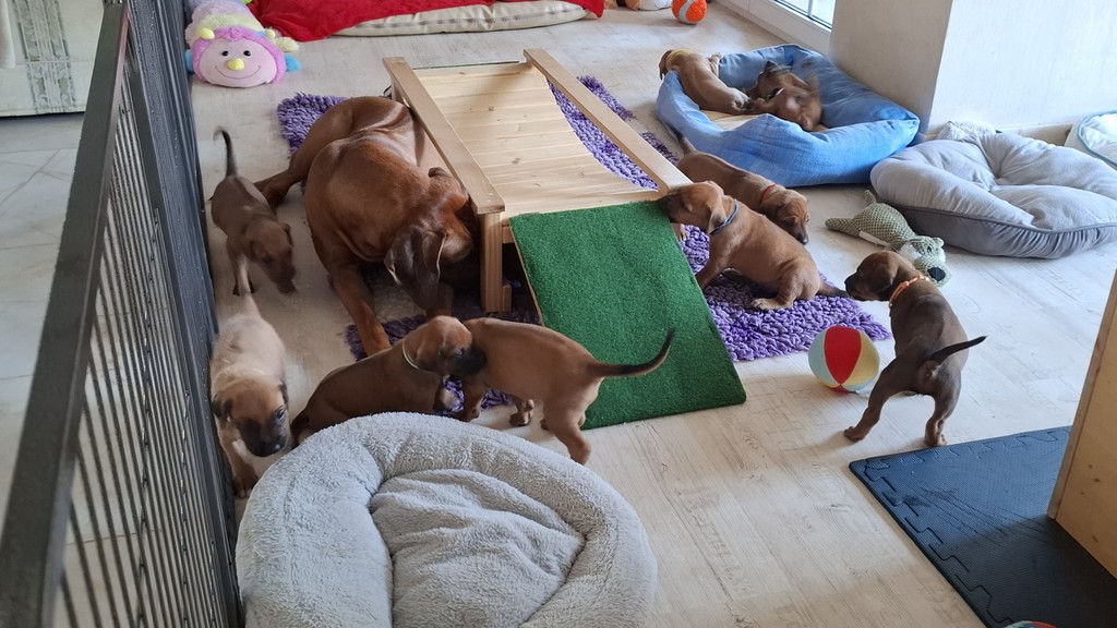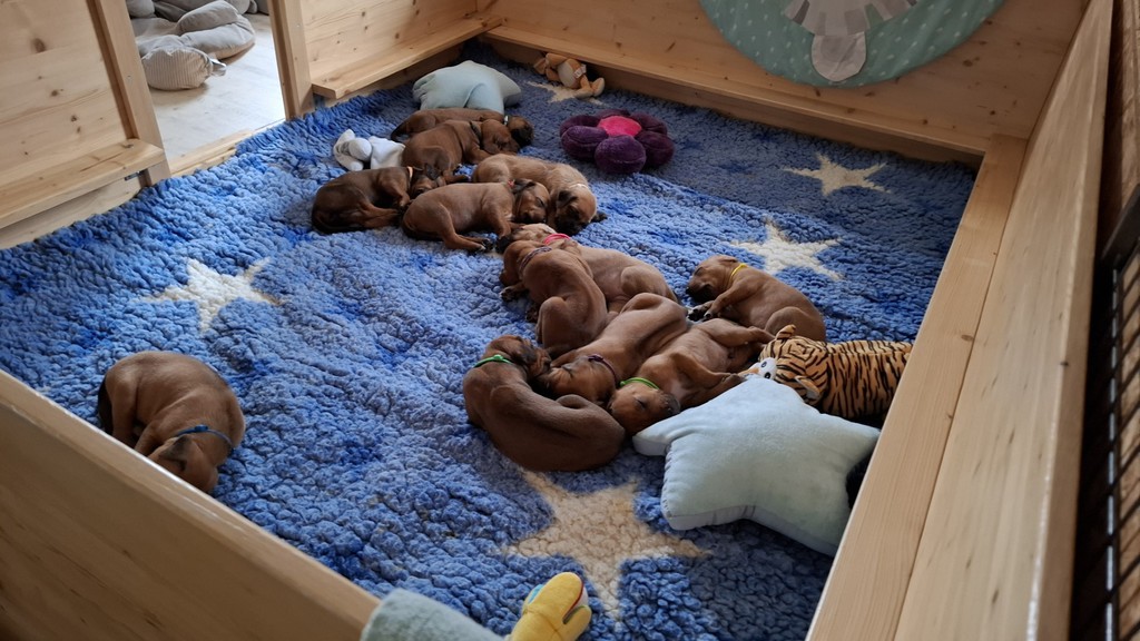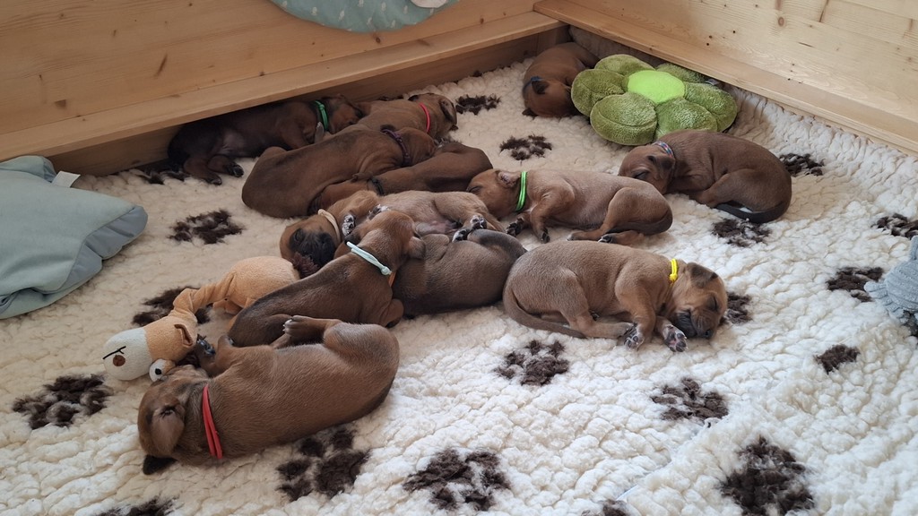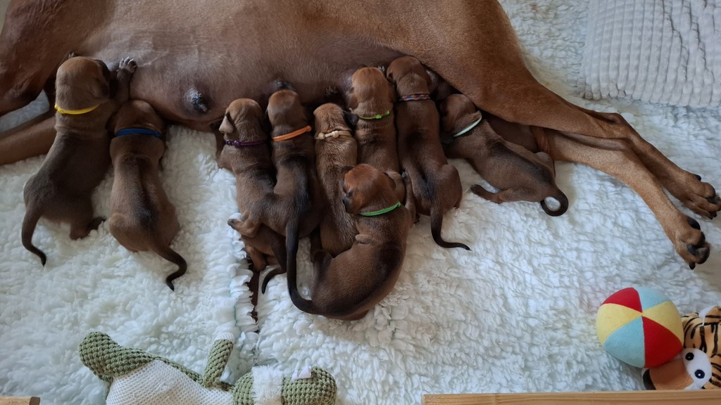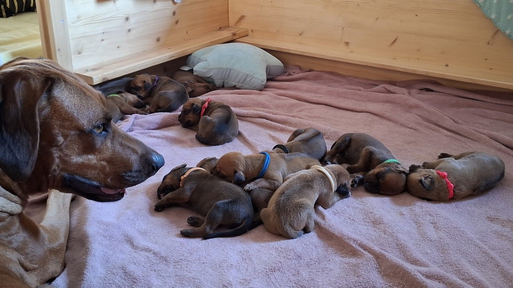 Unsere Maleika ist eine wundervolle instinktsichere Mama. Sie kümmert sich ganz fürsorglich und liebevoll Tag und Nacht um ihre 12 Welpen. Beim Ein- und Aussteigen aus der Wurfkiste ist sie besonders bedacht keinen Welpen zu berühren. Wir sind unendlich stolz eine so kluge Mammi zu haben.