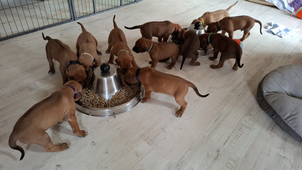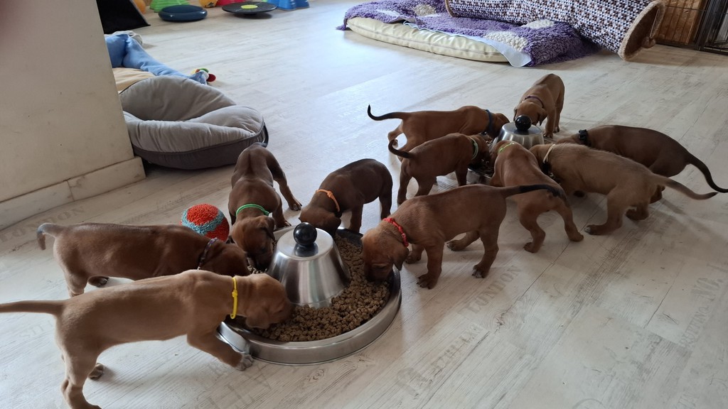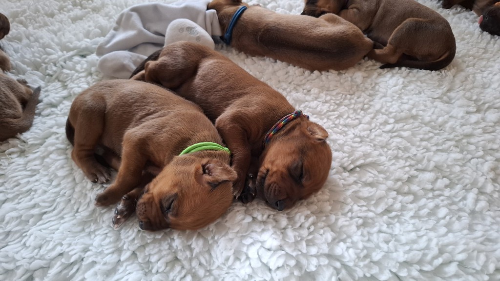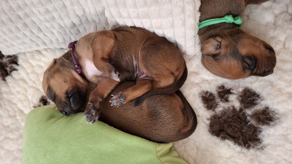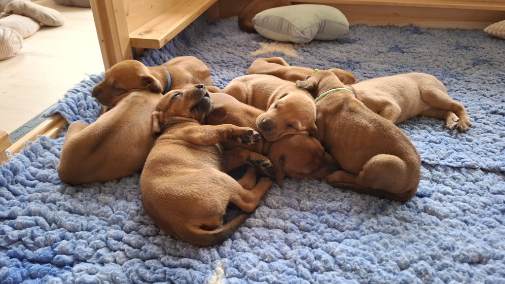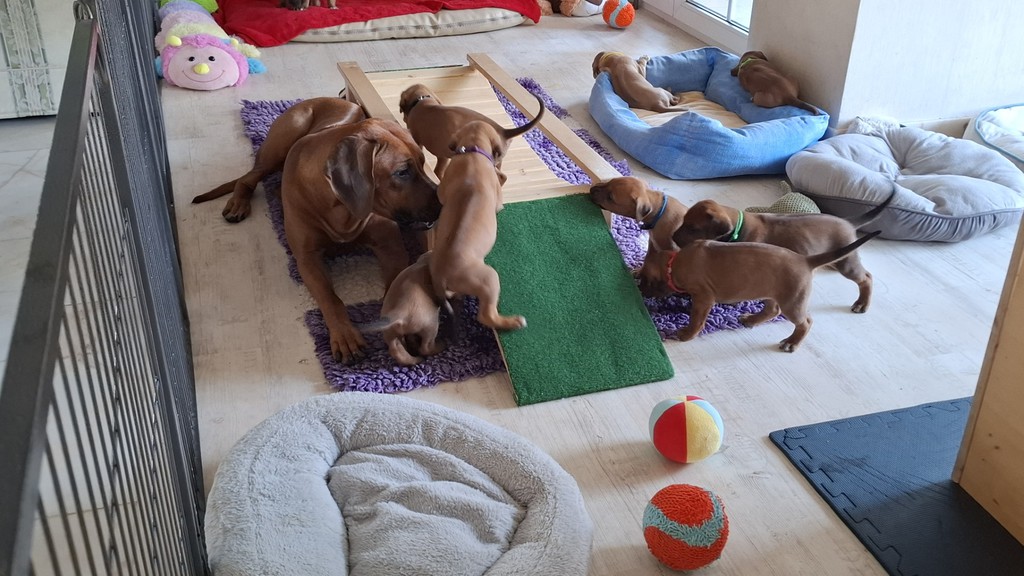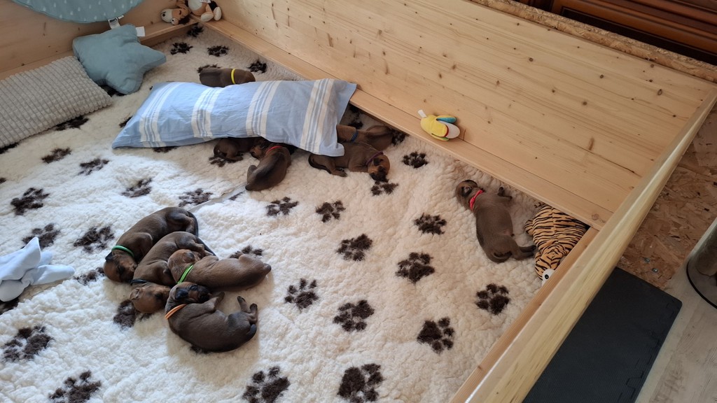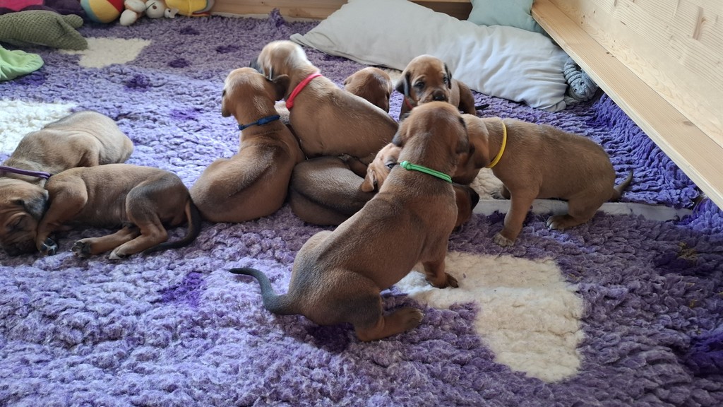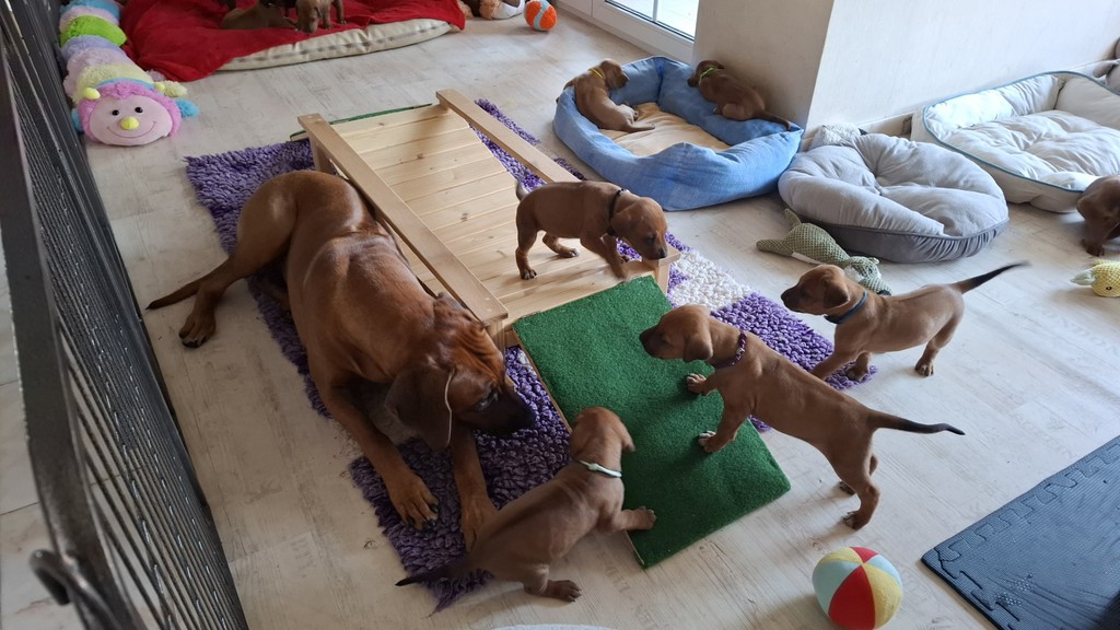 Unsere Maleika ist eine wundervolle instinktsichere Mama. Sie kümmert sich ganz fürsorglich und liebevoll Tag und Nacht um ihre 12 Welpen. Beim Ein- und Aussteigen aus der Wurfkiste ist sie besonders bedacht keinen Welpen zu berühren. Wir sind unendlich stolz eine so kluge Mammi zu haben.